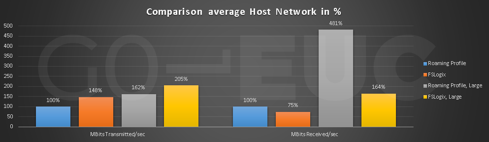 We should see similar results if we compare the scenarios from a network perspective. Namely, from a Windows roaming profile scenario: ‘copying’ and ‘receiving’ the entire profile from a network share will impact network resources. Whereas, FSLogix has less impact on receiving the container, as it is a copy of an entire profile in a single file (container).